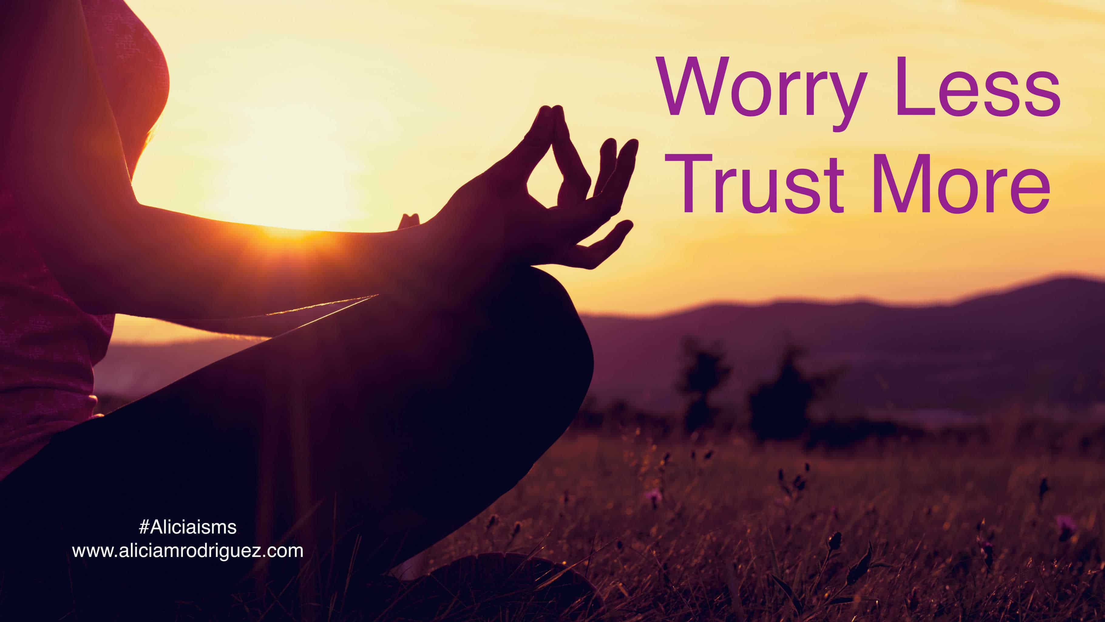 Worry Less. Trust More. My recent mantra! Young athletic woman practicing yoga on a meadow at sunset, silhouette