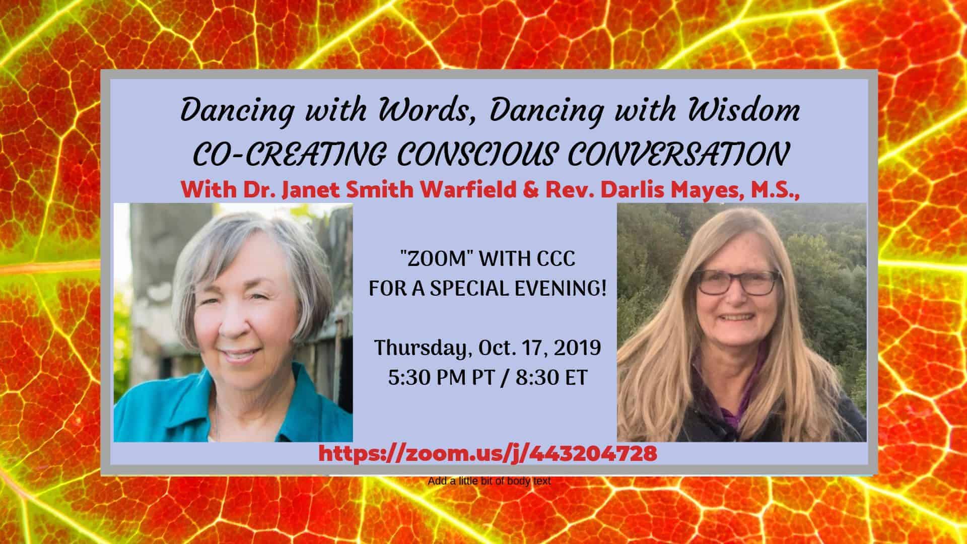 Join us Thursday, 5:30 p.m. PT/8:30 p.m. ET, to EXPERIENCE a conscious, co-creative conversation, LEARN HOW to use your words consciously and co-creatively, and PARTICIPATE IN a conscious, co-creative conversation. Co-creating conscious conversation – 10-17-19